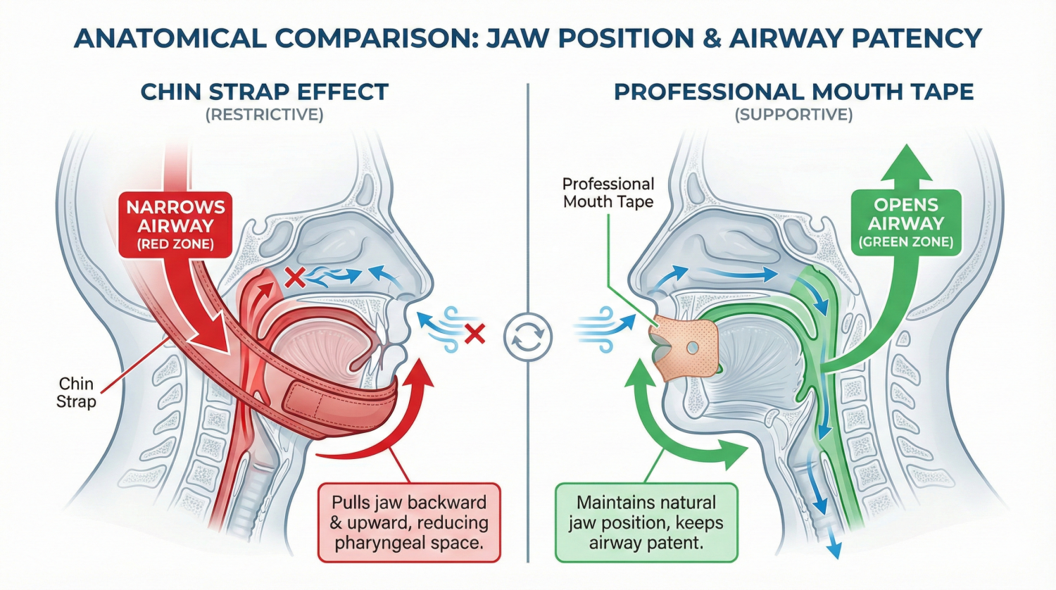 Most chin straps work by pulling your lower jaw (mandible) upward. However, because of the wrap angle around your skull, the force isn't just vertical; it’s backward. This is what we call the "Jaw Trap." This backward force can compress the jaw joint and push the base of the tongue toward the soft palate. In our analysis, we've seen that for many users, a chin strap can actually increase breathing resistance. A strap is a "brute force" solution; mouth tape is a "soft signal" that guides your lips without shifting your skeletal structure.